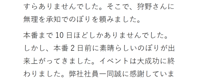 イベントに出展されるために「のぼり」が必要とのことで、既製品のデザインのものなら数日で入手できますが、 会社のオリジナルのものが欲しいという案件でした。 ギリギリ間に合いましたのでほっとした案件でした。 ありがとうございます。…